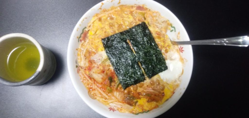 おじや(海苔乗せ)&煎茶。さすおに3 4話視聴。さすおにがさすおにし出した😊
