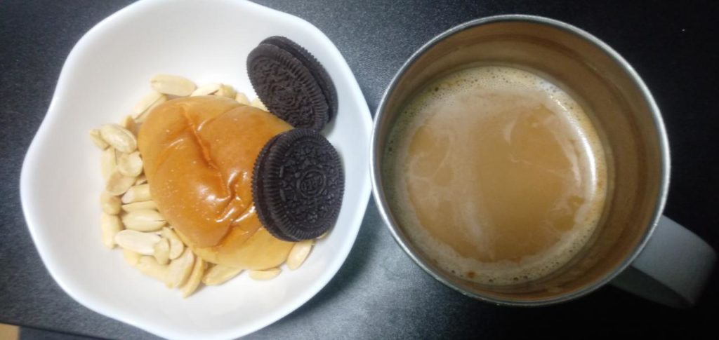 ヨーグルト食べた後、コーヒー&お菓子(ロールパン、オレオ、柿ピー)・・・食いすぎ?でも家計相談でお菓子食べても大丈夫言われたし😊