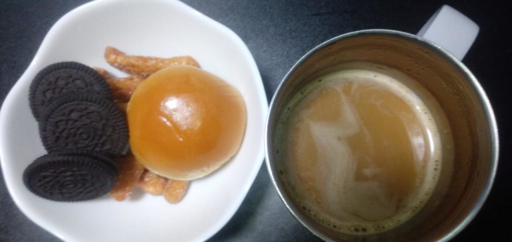 8:00コーヒー&お菓子(ロールパン、かりんとう、OREO風クッキー)。しまった!まだ薬飲んでなかった・・・。これ食べた後に飲もう。グレープフルーツジュースはだめらしいけど、コーヒーは大丈夫よね?
