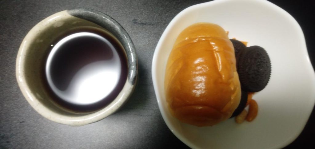 今日はこれ以降予定なし。Amazon Music、ABEMAニュース、DBD配信流しながらじゃんたま。麦茶、5/25期限切れロールパン、OREO風クッキー、柿ピー(写真)