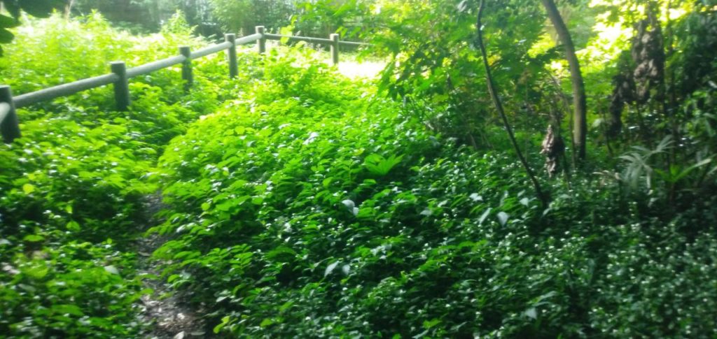 16:40散歩。2km先にある新たな公園へ。途中までネコ公園と同じ道。別れてから坂を下っていく。到着・・・。山である。山道を分け入っていく。これ余り人、通ってないよね?